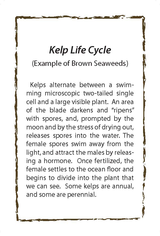 Life cycles of aquatic organisms are distinctive. Who knew that a seaweed could swim? Knowing about seaweed life cycles is both fascinating, illuminating, and complex. These are examples of the life cycle cards included in the teaching flashcards, meant to simplify the life cycles.